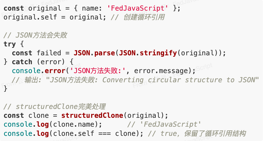 这种方式,但它存在众多限制。好消息是,现代JavaScript为我们带来了原生的解决方案: structuredClone() 方法。