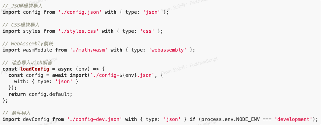 ES2025对import assertions进行了增强,让模块导入更加安全和灵活: